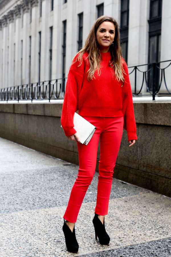 Сложное сочетание красных цветов в одежде — красные брюки и свитер
