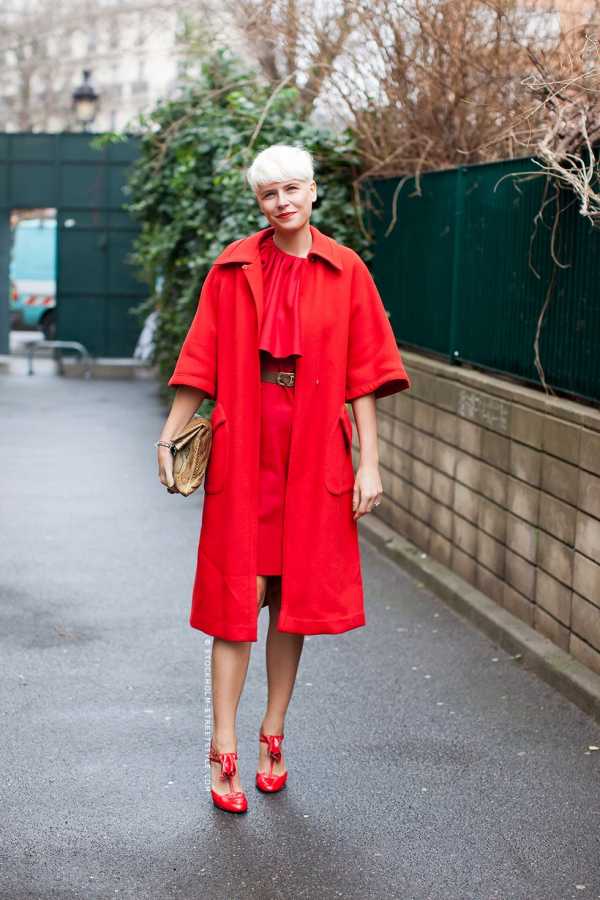 Страстный красный цвет в одежде – сочетание красного платья, пальто и туфель