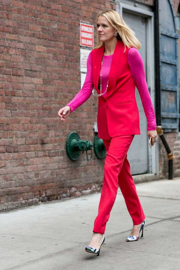 Интересное сочетание красного цвета с одеждой розового цвета