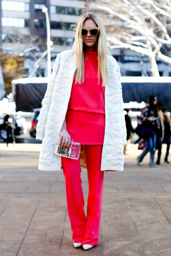 Розовый цвет – производный от красного, вместе они хорошо смотрятся и не требуют присутствия сторонних оттенков. Небольшие серебристые элементы в виде поясов или пуговиц придадут образу законченный вид.
