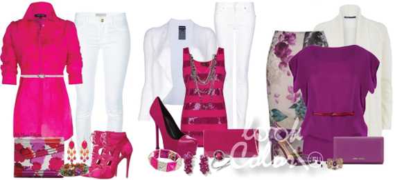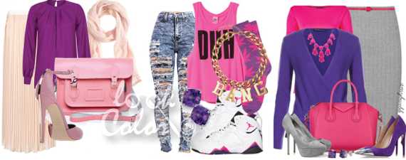 Кто считает фиолетовый грустным цветом? Это уникальное сочетание заставит вас примерить такой образ. Микс тонов может быть использован как в отдельных предметах одежды (пиджаке, кардигане), так и в качестве аксессуара.