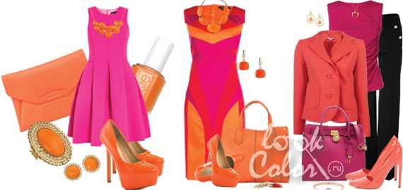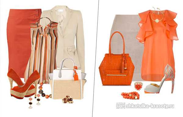 Бежевый сочетается с оранжевым. Оранжевый, как и бежевый, состоит из красного и желтого, является родственном цветом. Его бледные оттенки составляют естественные, гармоничные, мягкие пары. Но яркие и темные тона сочетаются уже с нейтральным цветом, используя средне-бежевый, как поддерживающий фон, усиливающий общую теплую гамму пары. В комбинации изображены персиковый, оранжево-коралловый, золотисто-медный, красно-оранжевый, рыжий цвета.