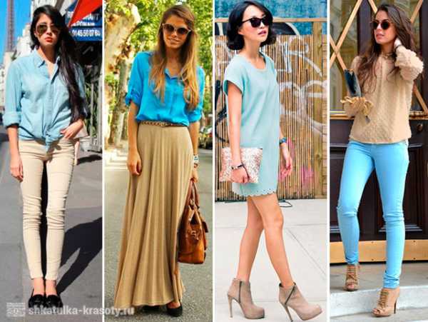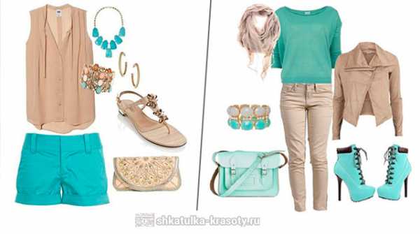 Сочетание цветов в одежде «бежевый цвет + голубой, мятный или бирюзовый» смотрится по-летнему легко, задорно и свежо.