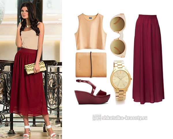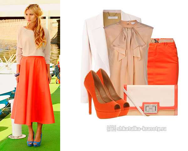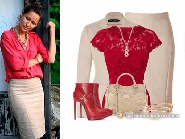 Яркая красная юбка или брючки в комплекте с бежевой блузкой или топом — вариант для наряда на каждый день. Также совмещать красный и бежевый можно и в вечерних луках, но тогда, я бы рекомендовала красный лишь в качестве дополнительного в виде аксессуаров к основному бежевому платью или костюму.
