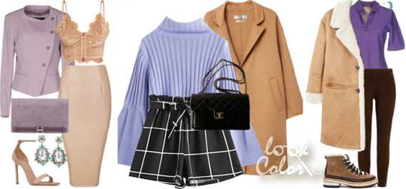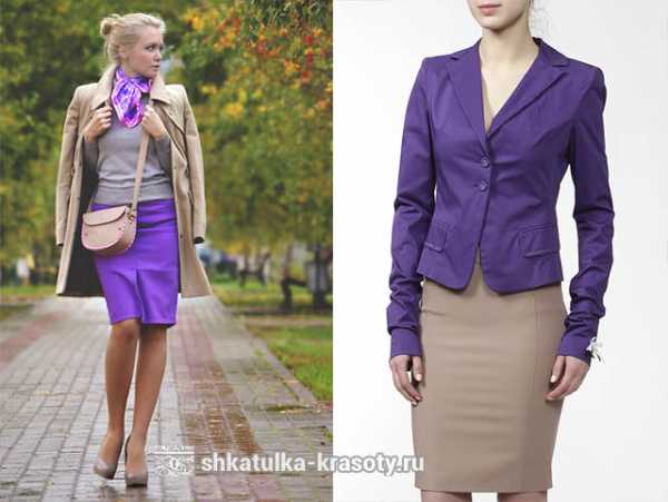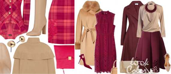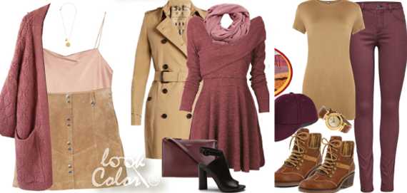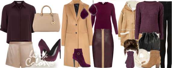 Сочетание цветов в одежде: бежевый + фиолетовый — делает образ нежным, теплым и уютным. Интересно смотрятся вариации образов с красноватыми винными оттенками.