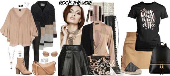 Сочетая бежевый с черным цветом, можно получить более строгий и деловой колорит, который превосходно впишется в рамки деловой встречи или офисных рабочих будней. По соотношению цветов в комплекте — одного должно быть больше, чем другого. Например можно надеть бежевый пиджак под абсолютно черный лук, такой наряд будет смотреться очень стильно.
