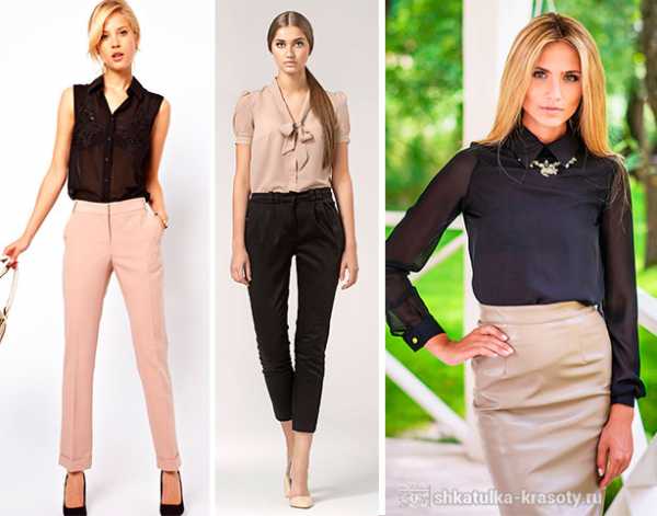 - Для офисного делового стиля можно подобрать достаточно сдержанное сочетание в стиле » светлый верх и темный низ», этот самый «темный низ» может быть представлен в одном из следующих цветов: черный, серый коричневый, альтернатива — белый.
