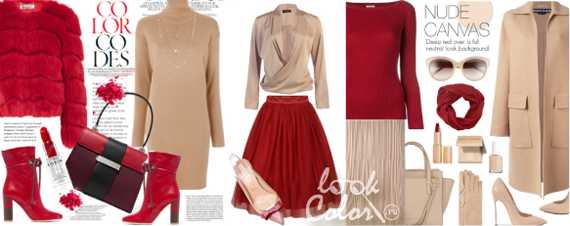 Сочетание цветов в одежде: бежевый цвет с ярким красным в едином образе — смотрится достойно, смело и оригинально. Бежевый выгодно подчеркивает красный цвет и одновременно уравновешивает образ в целом. Такое сочетание – отличное решение для повседневного образа.