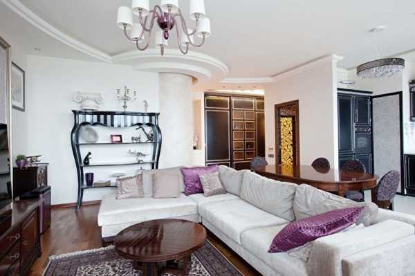 В гостиной можно использовать как основной (для стен, текстиля и т.д.) фиолетовый или пастельный светлых оттенков