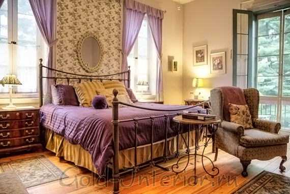 - Лиловый хорошо сочетается с нейтральными оттенками, к коим относят коричневый цвет. Но их тональность не должна сильно различаться — посмотрите, как это правило соблюдено в следующей спальне. Здесь мы видим насыщенный сиреневый, близкий к фиолетовому, выглядящий весьма уютно. Деревянные оттенки не затмевают его, а подчеркивают – медовые и соломенные тона станут наилучшим вариантом.