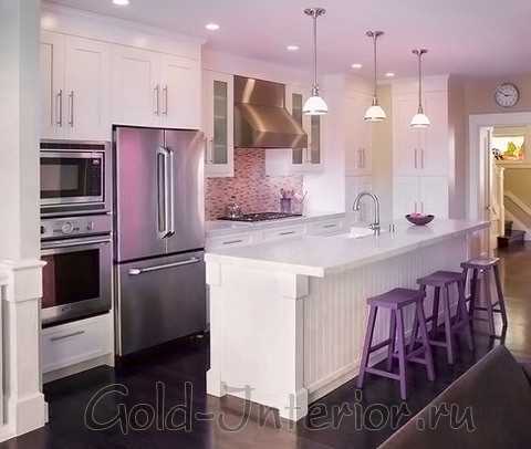 - На следующем фото представлен классический интерьер кухни, какой можно встретить во многих современных квартирах. Все просто, удобно и практично – и за этой продуманностью теряется индивидуальность. Нет нужды отказываться от любимого белого и серого, стоит просто поставить два дополнительных штришка. Здесь их функцию выполняют шелковистый шоколадный и матовый лиловый, а объединяет их вместе мозаика на кухонном фартуке, из двух этих цветов.