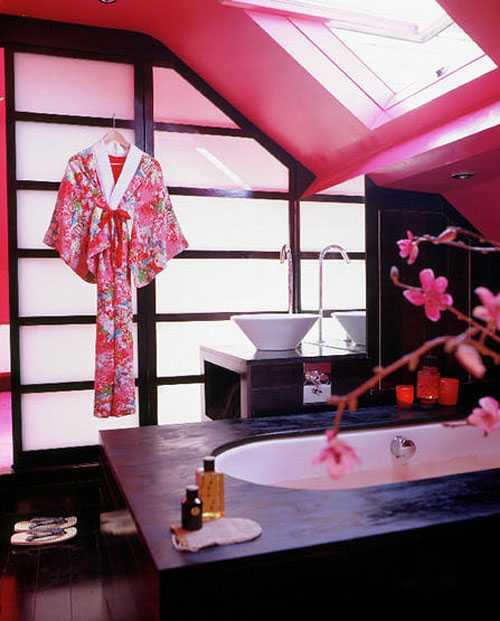 Розовый и черный. Не менее требовательным к продуманному дизайнерскому проекту является сочетание розового с черным. Используя эти краски можно сделать интересный интерьер ванной комнаты в восточном стиле, французской винтажной спальни или детской.