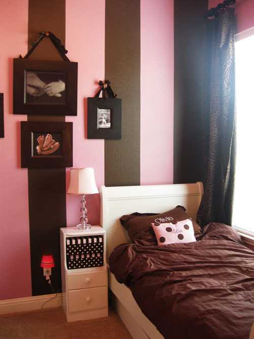Розовый и коричневый. Последним в моем списке, но далеко не последним, по количеству применений, являются розовый и коричневый. Этот классический дуэт довольно часто используется в детских, когда родители хотят подчеркнуть назначение комнаты, но не хотят делать ее слишком приторной. Хорошо будет смотреться это сочетание и в других комнатах (спальнях и гостиных), особенно если вместо темно-коричневого использовать оттенки какао.