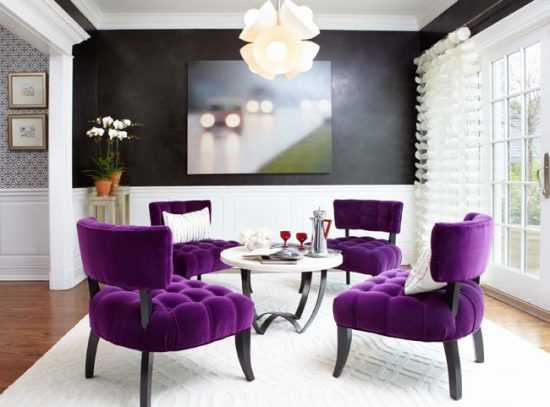 С черным получается слишком яркое и оттого не самое удачное сочетание. Однако если взять светлый или близкий к розовому тон фиолетового, комбинация станет более жизнеспособной и вполне подойдет к современной гостиной, особенно если разбавить эти два цвета белым.