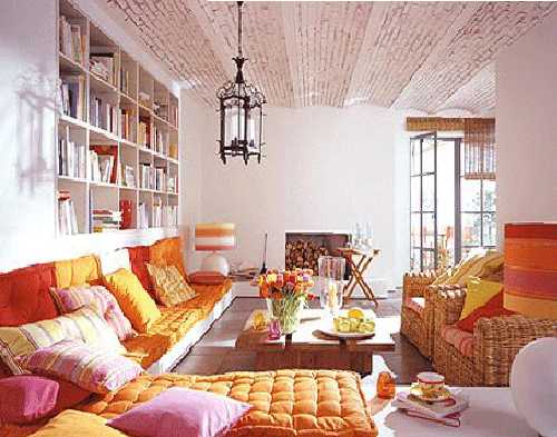 Сочетание с оранжевым цветом достаточно насыщенное и редкое. Оно настолько яркое, что обычно его разбавляют светло-зеленым или белым. Вполне уместно эта комбинация будет смотреться в детской.