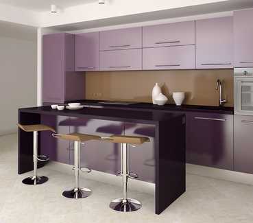 Фиолетовый на кухне хорош практически в любых сочетаниях, от самых темных до очень ярких. Для стиля хай-тек и минимализм стоит выбрать темные насыщенные тона — пурпурный, сливовый, фуксия; традиционно их сочетают с серебряным, серым или белым. В футуристической кухне будет уместен кислотно-фиолетовый в сочетании с белым. Также очень популярны кухни в пин-ап стиле: при создании подобного интерьера теплый желтый сочетают со светло-баклажановым. Актуальным для кухни является яркое сочетание красного и фиолетового: выбирая его, стоит помнить, что эти тона должны гармонично сочетаться по уровню теплоты и яркости.