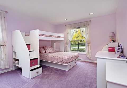 Обычно для детских не рекомендуют использовать фиолетовый: этот цвет представляется слишком «взрослым» и мрачным. Однако светлые оттенки — сиреневый, светло-черничный, лавандовый — могут с легкостью заменить белый. В сочетании с желтым, оранжевым или зеленым комбинация выйдет яркой, теплой и уютной.