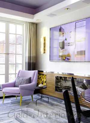 Сиреневый цвет весьма капризен, раскрывая свои лучшие качества только в подходящем окружении. Он минорен, посему в сочетании с пульсирующими теплыми цветами уходит в тень, и традиционно его дополняют такой же холодной гаммой. Сиреневый не столь требовательный к свету, приобретая в его отсутствии синеватый оттенок, который также выглядит дорогим и необычным. Да, он заметно холодит, поэтому подойдет любителям свежести и простора. Как правило, интерьер заранее строится с оглядкой на него, но мы рассмотрим несколько вариантов, где сиреневый выступает второстепенным персонажем.