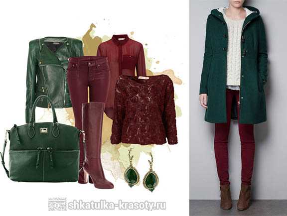Для комбинаций с бордовым подбирайте более яркие оттенки (марсала, бургунди, кармин) так ваш образ будет более контрастным.