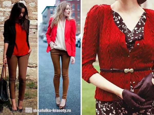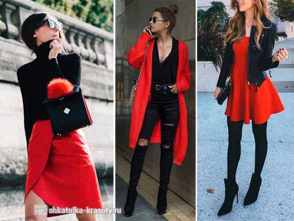 Очень стильно смотрятся образы, где однотонный темный лук дополнен одной красной вещью, например, красные туфли или сумочка, а может быть черный костюм и красный пиджак или пальто. Версия, где красного очень много кажется напряженным и перенасыщенным, поэтому он точно не подойдет для офиса, а вот для неформальных мероприятий и встреч может быть уместен.