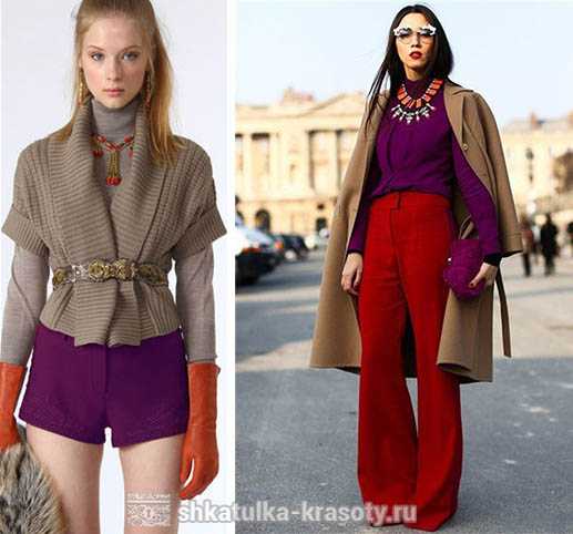 Серо-коричневый + фиолетовый + красный (или оранжевый) — яркое, эффектное и динамичное решение для смелых модниц.