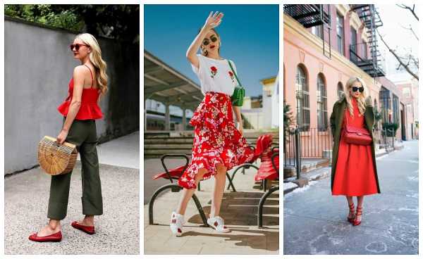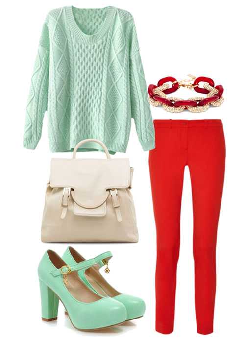 Но тут всё дело в пропорциях. Ведь можно к наряду, например, в бело-зелёной гамме подобрать красные аксессуары. Объём цветового пятна будет невелик и позволит комплекту выглядеть ярко, но не кричаще. Такой ансамбль вполне подойдёт и на каждый день.