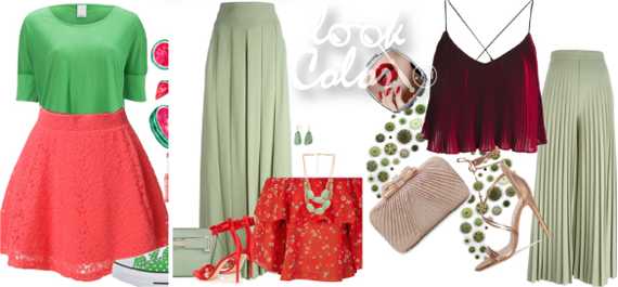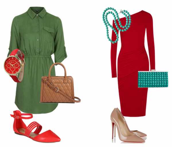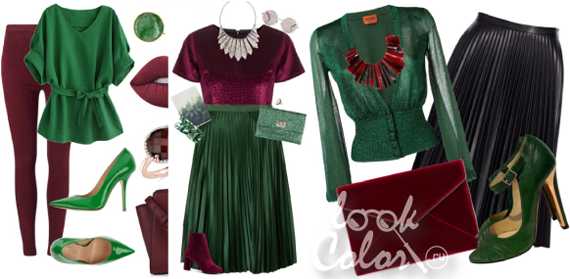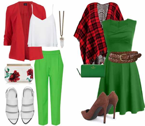 Сочетание красного и зёленого красивое и запоминающееся. В таком комплекте остаться незамеченной просто невозможно. Грамотно подбирая оттенки и следуя советам стилистов, можно создать великолепные и яркие комплекты.