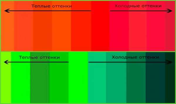 Зелёный имеет множество оттенков, которые зависят от того, какой цвет в его основе преобладает. Если синий присутствует в большем количестве, то оттенок зелёного холодный. И его психологическое воздействие на человека также приближается к воздействию синего цвета. Если же жёлтого больше, оттенок тёплый.