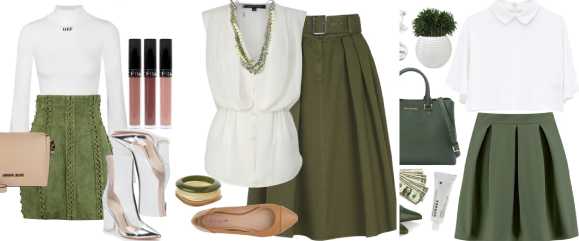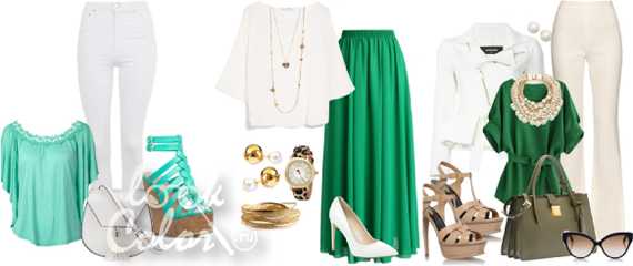 Ощущение от сочетания белого с зеленым в одежде зависит от тона основного цвета: если светлые пастельно-зеленые оттенки комбинируется со сложно-белыми: кремовыми, молочными тонами – пара имеет романтичный характер; яркие теплые или холодные и ярко-белый – летний, свежий контраст; оливковые, хаки, темно-зеленые образуют строгий, вычурный образ. Не редко в тандем насыщенно-зеленого и выразительно-белого добавляют черные и золотые аксессуары, что повышает общий контраст, сочность колорита.
