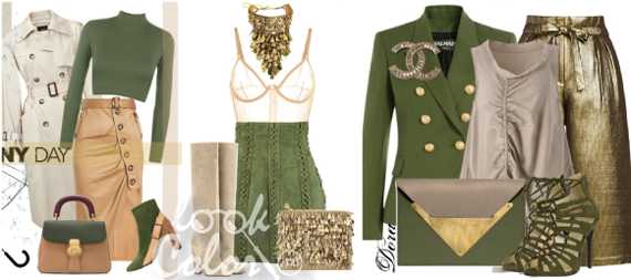 Сочетание в одежде бежевого и зеленого – попытка придать жизнерадостным оттенкам элегантности, при этом бежевый практически стирается из нашего взора за счет сходства с основным, доминирующим колоритом. Наилучшим вариантом будут теплые и светлые оттенки бежевого, которые гармонично соединяются с зеленью в теплую гамму. Это к тому же естественная комбинация, так как в природе нейтрально-бежевые часто оказываются вместе с насыщенно-зеленым, оливковым и др… Для большего эффекта добавляется золотые или черные элементы.