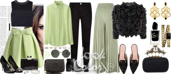 Сочетание черноног и зеленого в одежде является классикой. Черный усиливает насыщенность любого оттенка, в том числе и зеленого. Даже очень бледный цвет приобретет насыщенность, грациозность рядом с самым контрастным тоном. Лучшими вариантами будут сочетания с бледно-зеленым или ярко-зеленым. Если вам интересен вечерний образ, то темно-зеленый + черный будут весьма актуальным вариантом.