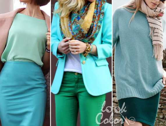 Сочетание голубого и зеленого в одежде может быть бесконечно трепетным, а может быть строгим или ярким. Голубой очень близок к основному колору, некоторые его тона находятся на стыке, так водно-голубой и сине-зеленый можно принять за один цвет разной светлоты.