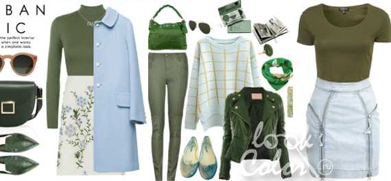 Самые, на мой взгляд, выгодные варианты – это мягкий, желто-зеленый в паре с небесно-голубым. Нежное, воздушное сочетание дополняется молочно-белыми, насыщенно желто-зелеными, светло-серыми, бледно-фиолетовыми тонами. Хаки с голубым – спокойная, городская композиция. Яркие оттенки зелени с голубым — элегантное, женственное, их выбирают стильные женщины. Комбинация насыщенно-зеленого вместе с сине-голубым подходит для контрастной внешности. А темно-зеленому этот цвет придает строгость, а также деловую изюминку.