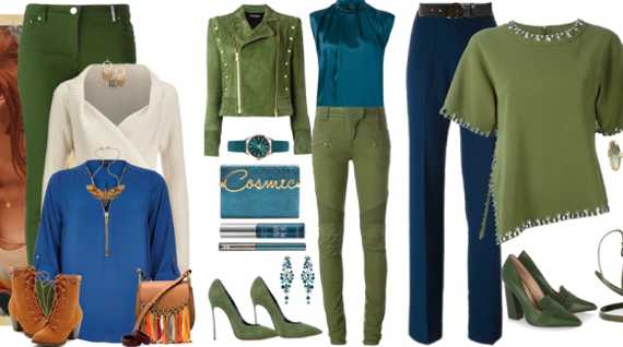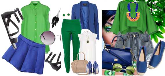 Сочетание синего и зеленого в одежде полностью раскрывает основной цвет: он оттеняет, углубляет, делает сочетание строже или придает ей игривость в зависимости от насыщенности синего. Но более гармонично оно смотрится в компании с белым, коричневым или бежевым, а также с элементами черного, золота или серебра.