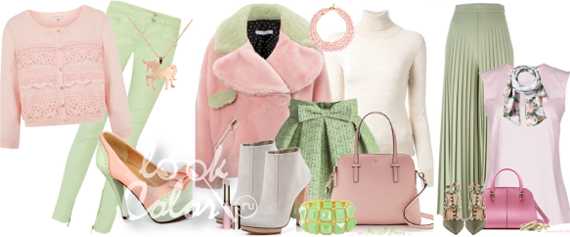 Сочетание зеленого и розового в одежде – милое, невесомое или насыщенное, чудесно привлекательное – все зависит от светлоты или насыщенности обоих цветов. Пастельная гамма из нежно-розового и бледно-зеленого будет смотреться еще нежнее с молочными, кремовыми тонами. Бледно-розовые с насыщенно-зелеными образуют выразительный, мягкий, привлекательный тандем, готовый принять в свое «общество» серый, коричневый.