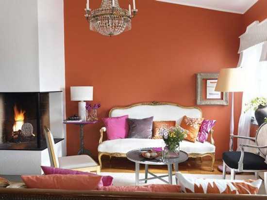 - Выбор оттенка зависит от того, какой эффект должна будет производить гостиная. Для создания спокойного интерьера лучше подойдут персиковые, абрикосовые и охряные оттенки. Для создания динамичной атмосферы лучше выбирать яркие апельсиновые оттенки.