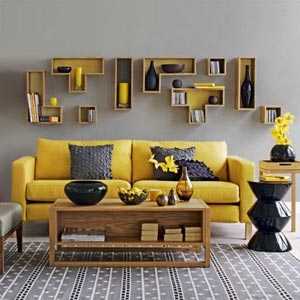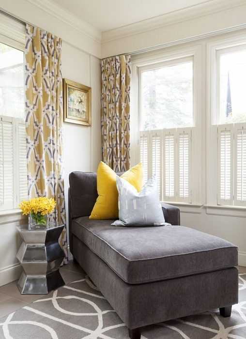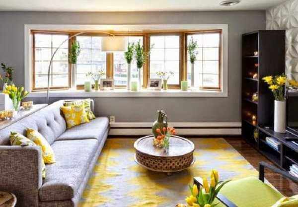 Большие площади стенных поверхностей отделываются серым. Мебелировку берут серую, темную, светлую или древесную. Желтый тон в помещение добавляется малыми вкраплениями: желтый пуфик, небольшой желтый коврик, желтая занавеска.