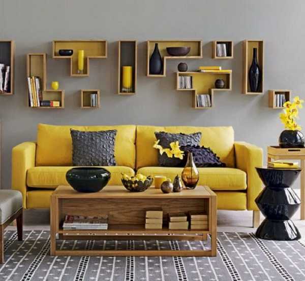 Интересный интерьер гостиной в серо-желтых тонах, что точно по особенному преобразит комнату такого плана.