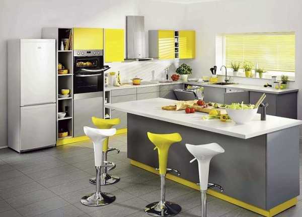 Красивое оформление кухни в желто-серых тонах, что выглядит очень достойно и прилично.