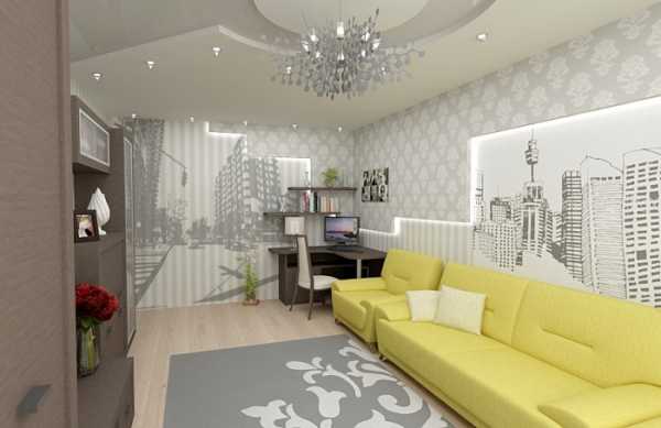 Прекрасная обстановка в комнате создана благодаря оригинальному интерьеру в желто-серых тонах.