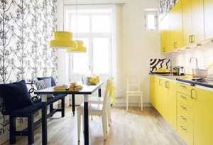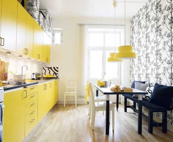 Например, в кухне возможен такой вариант. Бежевый пол, белые стены, желтые рабочие поверхности, кухонная мебель глубоких серых оттенков. В столовой зоне лучше наклеить белые обои с серым орнаментом, в тон мебели. А чтобы зона визуально не воспринималась мрачно и обособленно, на стене повесьте ярко-желтый светильник.