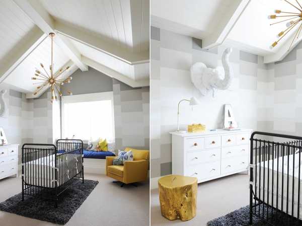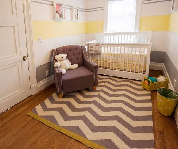 Жёлто-серая детская – это не только правильное сочетание цветов: дизайнер обладает возможностями разнообразить интерьер привлекающими глаз мотивами и необычными формами. Начать можно с полосатой стены или ковра с шевронным узором.