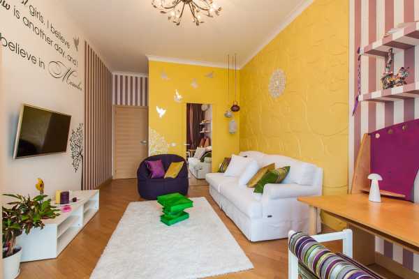 Желтая часть спектра, как и синяя и красная, считаются базовыми цветами. Психологи утверждают, что желтый цвет является стимулятором мозговой деятельности, способствует учащению сердцебиения и создает положительный фон именно для активной обстановки. Но стоит учитывать, что натуральный, в слишком ярких тонах, он слишком раздражающе воздействует на психику, и его не нужно оставлять без вкраплений других цветов и оттенков. Дизайн вашей гостиной должен создаваться на основе цветовых сочетаний, тем более что желтый цвет хорошо гармонирует с остальной палитрой. Более мягкие варианты желтого цвета ощущаются как что-то теплое, и ассоциируются с солнечным днем, что позитивно воздействует на человека, находящегося среди желтых стен.