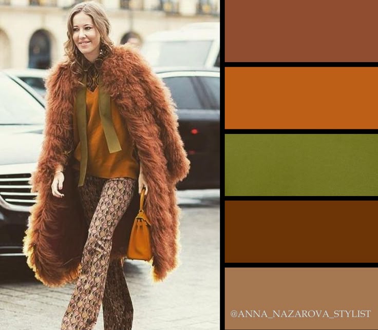 Это же сочетание, напротив, сама солнечность и жизнерадостность. Отличный вариант для хмурого осеннего или зимнего дня, формирующий вокруг вас ауру тепла и сияния: коричневый + оранжевый + жёлтый. Чтобы сделать образ более мягким и цельным, остановите выбор на спокойных тёплых оттенках оранжевого и жёлтого.
