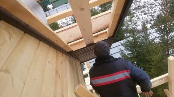 - Когда подшивка проводится по стропилам. Для этого выбирается угол, который должен совпадать с углом ската. Этот способ предназначен в большинстве своем для кровель с небольшим уклоном, при этом монтаж софитов на стропила осуществляется параллельно стенам. При неровной нижней плоскости стропил она должна быть выровнена для достижения оптимального результата подшивки кровельного материала. Можно для этого прикрутить по бокам стропил шурупами обрезки досок не менее 4 см толщиной, длиной – не менее 10 см. Первым делом прикручиваются начальная и последняя доски, натягиваются между ними нити, и уже дальше крепятся остальные доски. На тех участках, где сходятся скаты, крепление досок производят со всех сторон угловых стропил.