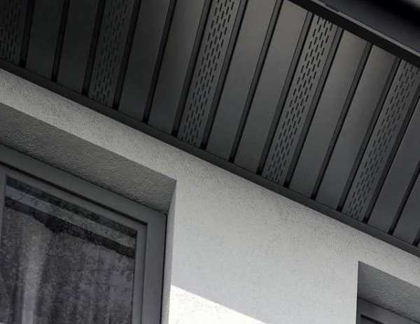 - Перфорированные полностью. Их рекомендуется применять на крышах с покрытием из непрофилированных материалов. Перфорированные софиты оптимально подходят для подшивки различных выступающих частей кровли: карнизов, коньков, свесов, козырьков и фронтонов.