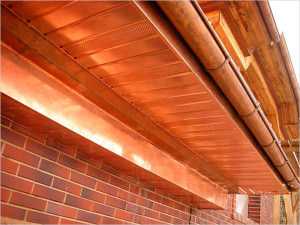 - Медные. Покрытие кровли с подшивкой карнизов крыши софитами из меди будет служить дольше других в связи с затуханием коррозии медного листа и отменной стойкости к воздействию агрессивной окружающей среды – оно вполне выстоит целый век и больше. Такие изделия без перфорации обычно устанавливают в помещениях, а перфорированными медными софитами хорошо подшиваются уличные постройки.
