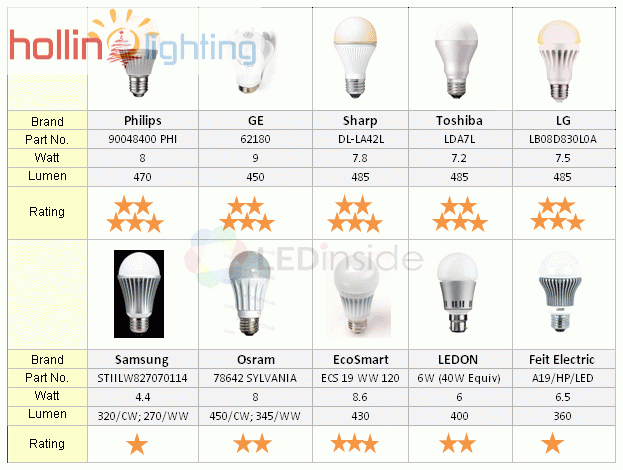 У большинства из нас есть предвзятое мнение о том, насколько яркой является 100-ваттная лампа накаливания, хотя она может сильно различаться между лампами из мягкого белого и прозрачного стекла. В среднем лампа накаливания производит около 14 люменов на ватт, по сравнению с 63 люменами для энергосберегающих компактных люминесцентных ламп (КЛЛ) и 74 люменами для светодиодных ламп. Некоторые из наиболее энергоэффективных светодиодных ламп в настоящее время достигают более 120 люмен в тестах Energy Star.