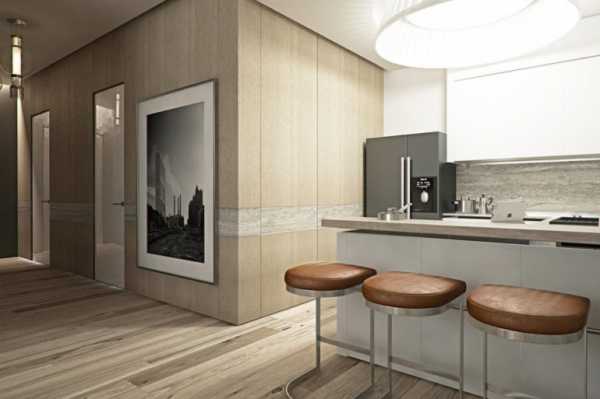 Важно: Вместо барной стойки можно сделать на месте стены своеобразный стол. Вместо опор можно при этом использовать аквариум с рыбками. Получится весьма оригинальный респектабельный дизайн квартиры. И в тоже время практичность тоже будет торжествовать – стол можно использовать по назначению.