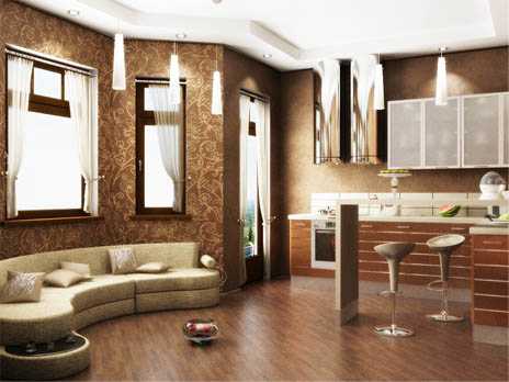 Дизайн совмещенной кухни и гостиной предполагает создание единого пространства, в котором для зонирования помещений применяются отдельные акценты. Выделить зону кухни можно при помощи разности отделочных материалов, используемых для отделки стен, пола и потолка. Это могут быть различные по контрасту или по рисунку обои, сочетание обоев в гостиной и кафеля на кухне; сочетание различных половых покрытий. Так вполне неплохо выглядит ковровое покрытие в гостиной и керамогранит или напольная плитка на кухне.